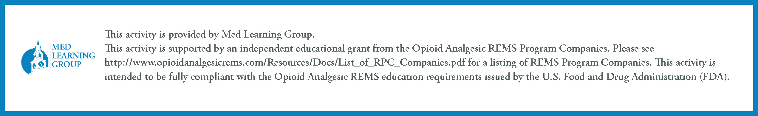 This activity is provided by Med Learning Group. “This activity is supported by an independent educational grant from the Opioid Analgesic REMS Program Companies. Please see https://www.opioidanalgesicrems.com/Resources/Docs/List_of_RPC_Companies.pdf for a listing of REMS Program Companies. This activity is intended to be fully compliant with the Opioid Analgesic REMS education requirements issued by the U.S. Food and Drug Administration (FDA).